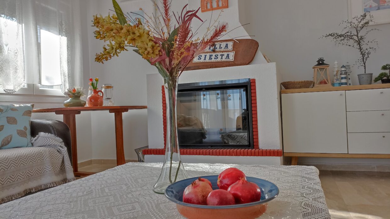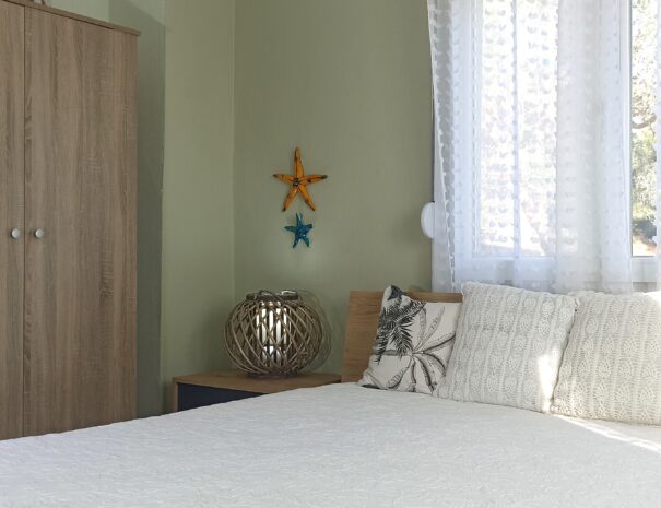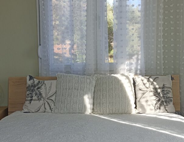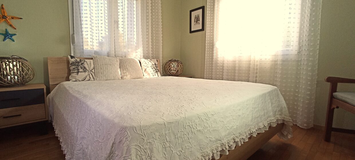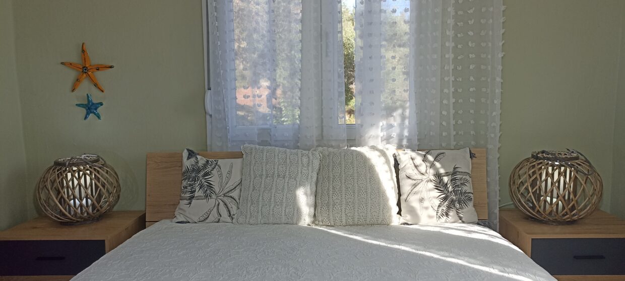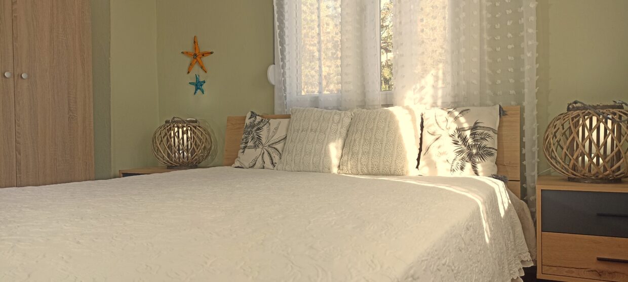 Villa Siesta features two comfortable bedrooms, with Bedroom 1 offering an extra-large double bed and Bedroom 2 furnished with two single beds. The spacious living room provides a perfect spot for relaxation, while the fully equipped kitchen ensures all modern conveniences for your stay. The villa includes a full bathroom and a balcony with a stunning sea view. Outside, guests can enjoy a large 500 m² enclosed garden, filled with olive trees and flowers, creating a serene outdoor space.